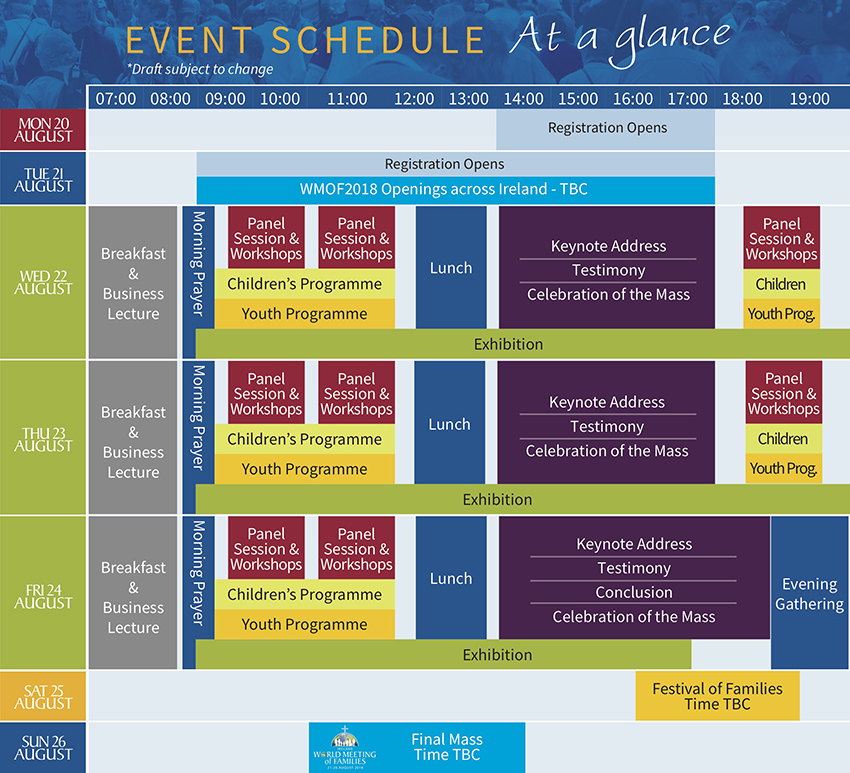 Family Day 2018 Dublin, 22-26 August, 2018 WMOF2018 Visit the official Website Visit the accomodation section for more information about hosting Register online (For Neocatechumenal communities only) Registration form Schedule